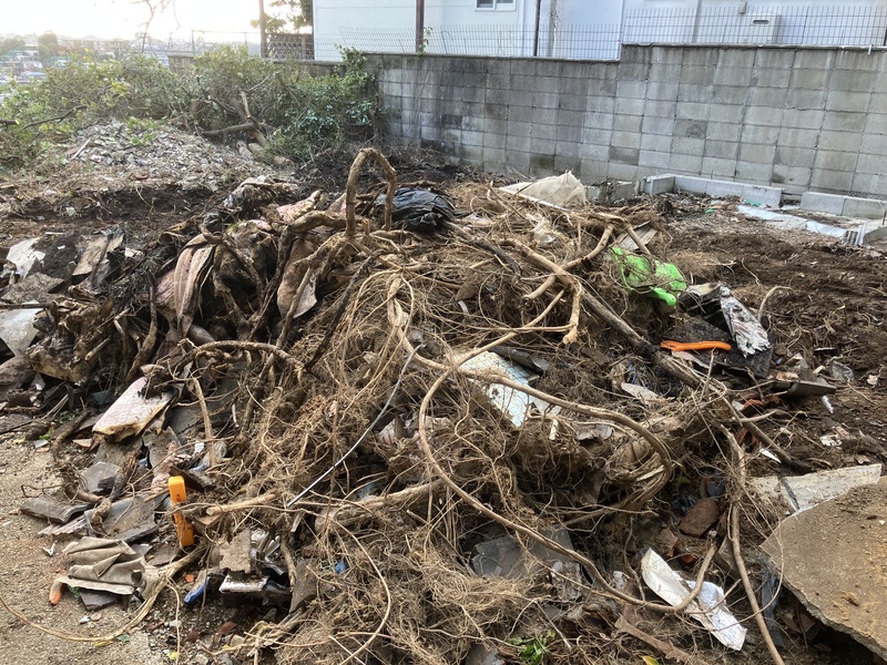 お陰で初日から敷地内に埋まっているガラや木の根っこなどを次々に掘り起こしていきました。(画像参照)